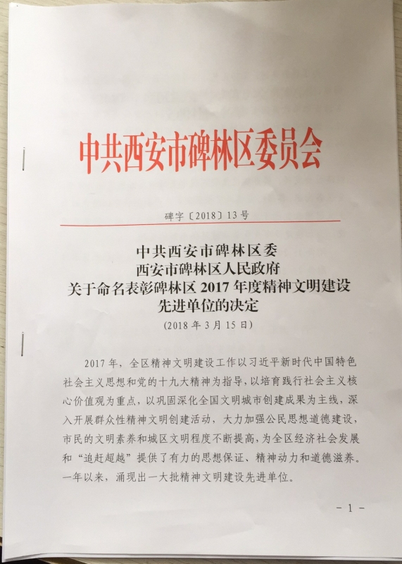 2017年,陜西千方科技發(fā)展有限責(zé)任公司申請“區(qū)級(jí)文明單位”,經(jīng)過一年的努力,公司在參與文明城市建設(shè)、學(xué)雷鋒、樹立公司形象等方面取得了一定成績,并于2018年3月20日正式授牌。